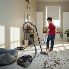 El motor de 650W ofrece una potencia adecuada para la limpieza diaria en suelos duros y alfombras. La tecnología ciclónica en elipse mejora la eficiencia de filtrado y permite mantener el flujo de aire estable incluso con el depósito parcialmente lleno.
